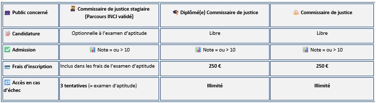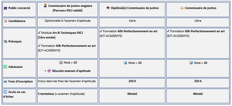 L’examen d’aptitude à la profession de commissaire de justice est accessible à l’issue de la formation initiale INCJ ou en cas de dispense de formation INCJ.